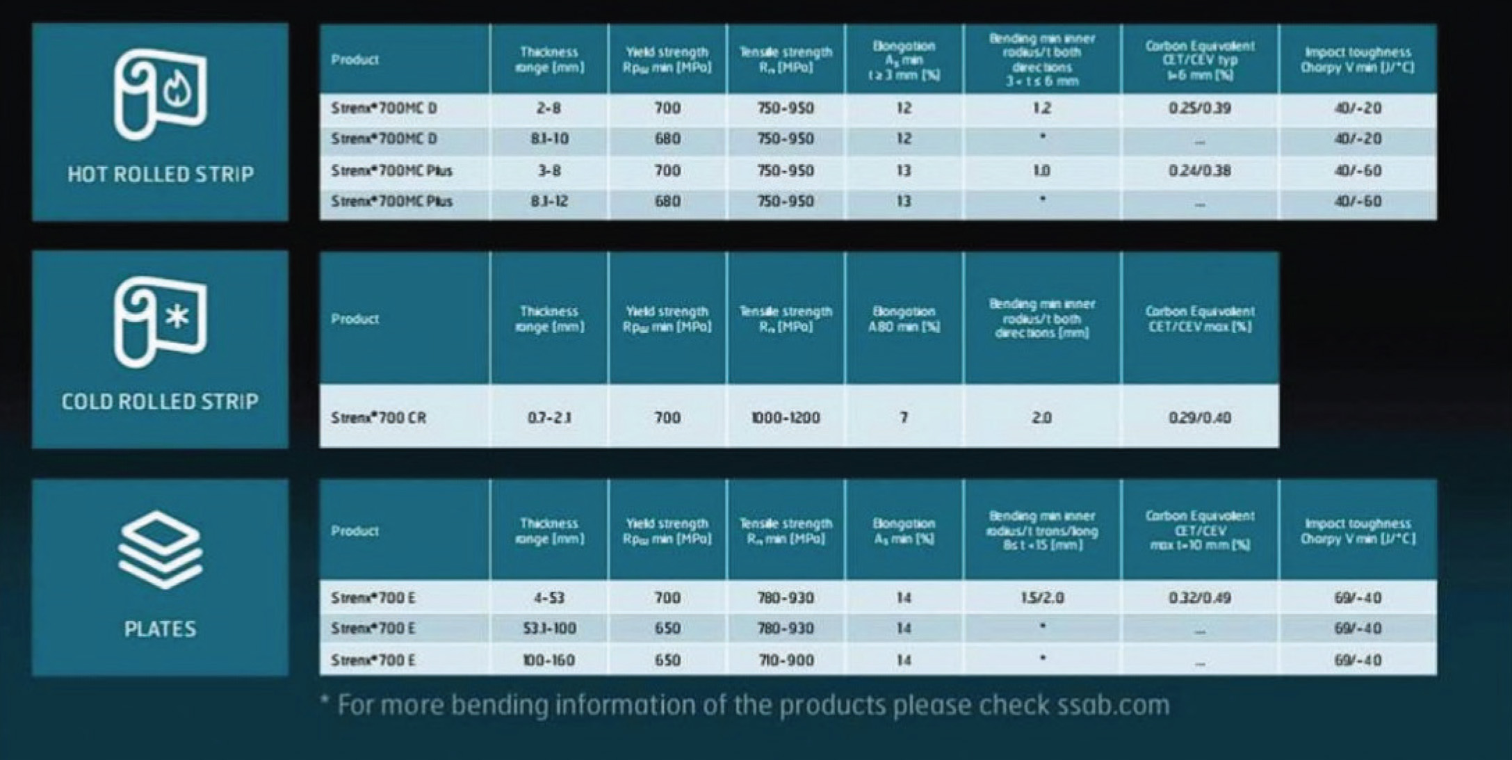 STRENX (Q&T HIGH TENSILE ALLOY STEEL) is a high grade structural steel plate with Yield stress minimum 700 MPA (3-5 times of mild steel), have a good weldability and formability, minimum thick• ness 4mm. Made in SSAB Sweden. Standard size: